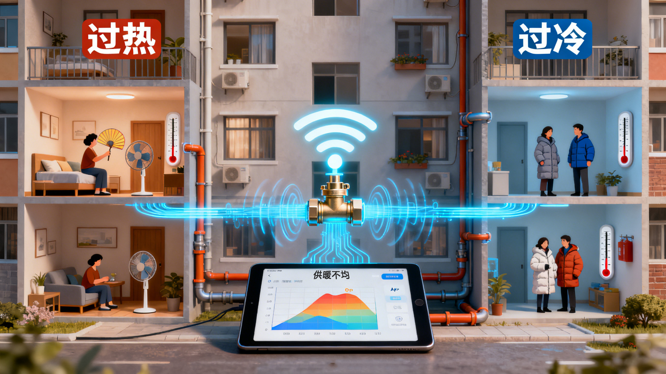 想象一下,我們的供暖管道如同人體的血液循環(huán)系統(tǒng)。熱水就是血液,需要被均勻地輸送到每個(gè)房間(末端,如暖氣片或地暖盤管)。水利失衡就是指,由于管道長(zhǎng)度、阻力不同等原因,導(dǎo)致離熱源(鍋爐或換熱站)近的“近端”循環(huán)過(guò)快,水流過(guò)大,房間過(guò)熱;而離熱源遠(yuǎn)的“遠(yuǎn)端”循環(huán)不暢,水流過(guò)小,房間冰冷。這不僅造成了用戶體驗(yàn)差,更導(dǎo)致了大量的能源浪費(fèi)。
